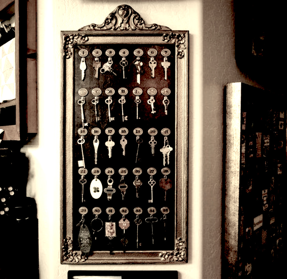 A wooden board behind the reception desk, framed in gilt, holds a grid of numbered hooks. From each hangs a key—no two alike. Some are long and slender, others blunt and worn, their teeth uneven from years of use. Small oval tags, each stamped with a number, rest above them in careful sequence.