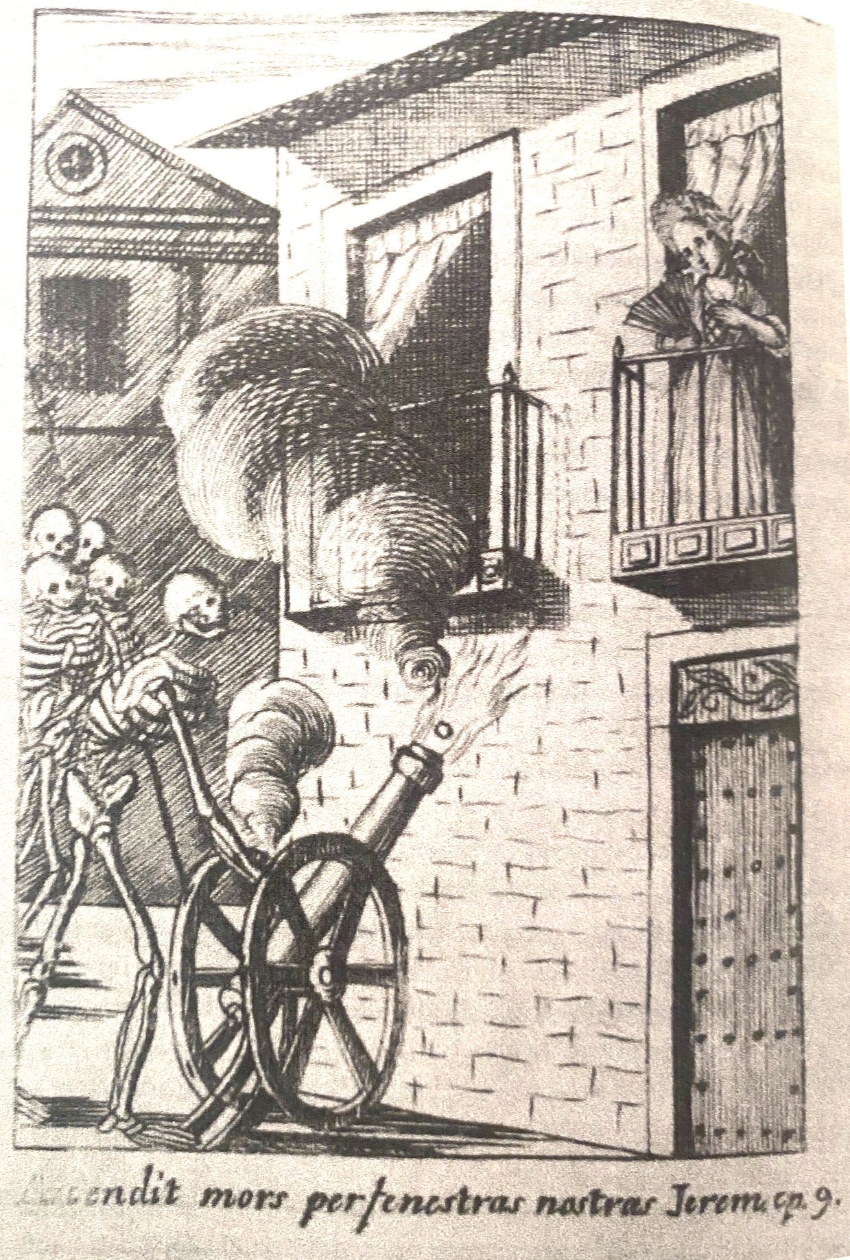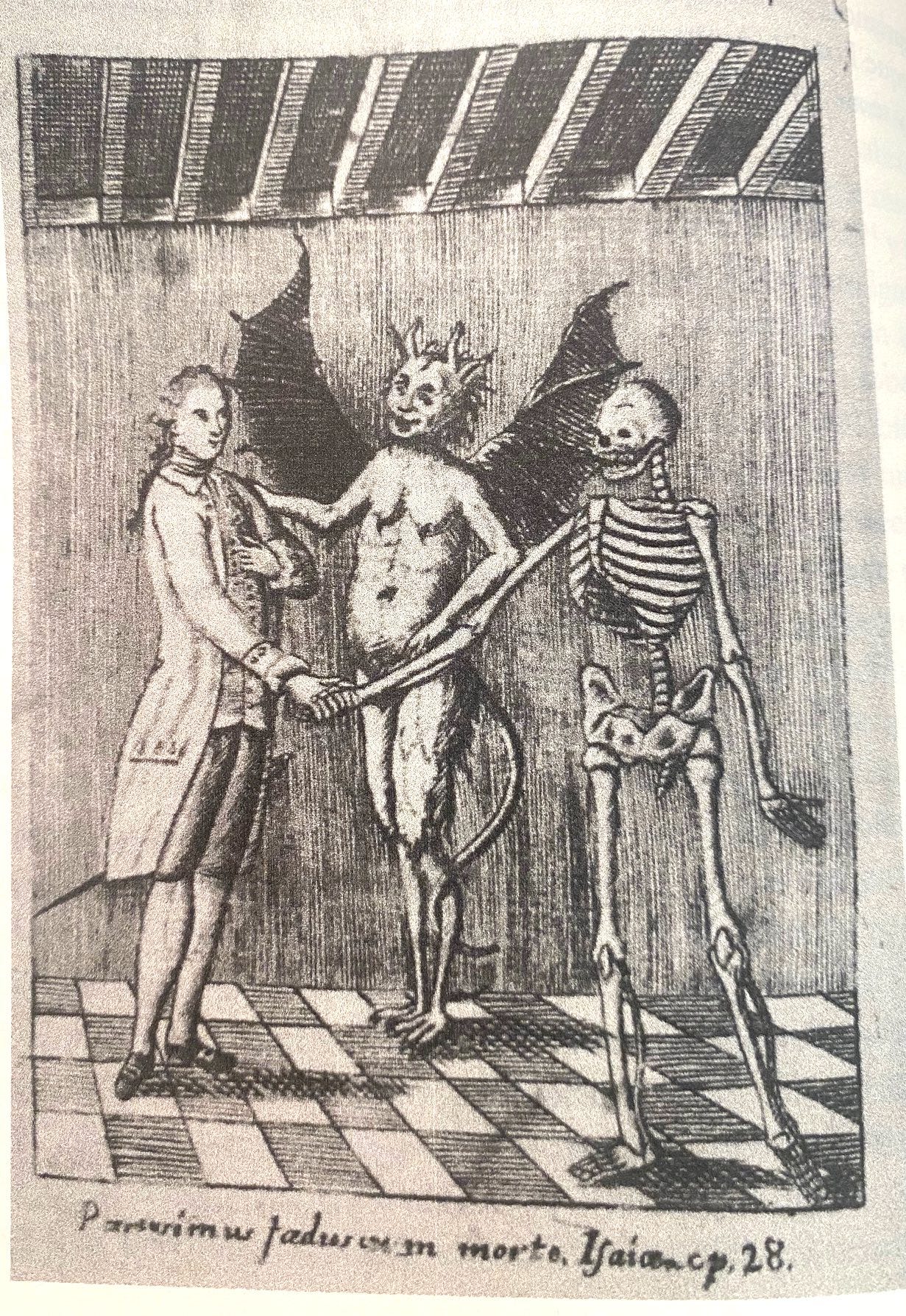 The novel details the various and whimsical adventures of Death as the hero of the story, experiencing the life events of a regular mortal, inflicting the perishing of humans throughout. The fact that it is a fictional narrative that was allowed for publication— in colonial times fiction was associated with lying and blasphemy— makes the book even the more interesting. Fray Joaquín, in the introduction, goes through great lengths in explaining why he has taken this approach, wanting to provide a moralizing narrative about the virtues of a good life by using humor — a method, he argues, allows him to “dorar la píldora” (sweeten the pill) of moral didacticism for the reader (I can’t also help but to note that Fray Joaquín was 81 years old when the novel was published, a really advanced age for the period, which makes me wonder about how much the author wrote this work while coming to terms with his own, inevitably approaching demise).